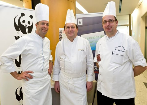 Lionel Rigolet, xef del restaurant Comme Chez Soi; Eric Coisel, del parisenc Prunier, i Jean-Claude Moucaud, mestre de cuina de L’Ecuelle de Luxemburg, han ofert un àpat a base de “peix sostenible” als membres del Parlament Europeu com a mostra de suport a la campanya de WWF contra la sobreexplotació pesquera.