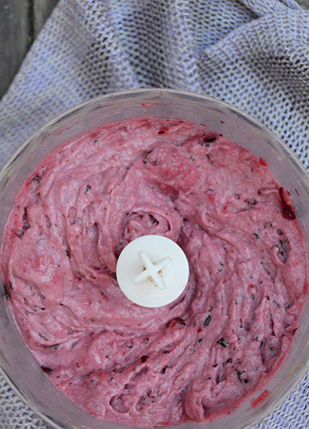 3. En un processador d’aliments afegiu el plàtan congelat i les cireres. Tritureu uns segons fins a aconseguir la textura desitjada. Si no teniu un processador gaire potent, podeu afegir una mica de beguda vegetal per facilitar el procés.