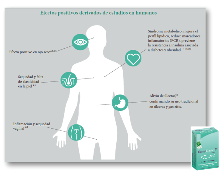 L’omega-7 és un lubricant de qualsevol mucosa del cos, i no només de l’ull. És lògic. A més, OmegaConfort 7 conté, amb la mateixa intenció, vitamina B2, que contribueix a mantenir pell i mucoses en condicions normals, i també és un bon antioxidant. Molts estudis han evidenciat els beneficis de l’omega-7 a la resta de mucoses del cos, per exemple, en casos de sequedat vaginal, habitual sobretot en el període de la menopausa i també en la sequedat de la pell. La Paula Palomares, que, a més de l’ull sec, té dermatitis atòpica, també ha notat una gran millora, sobretot des que acompanya les dues perles d’OmegaConfort 7 amb dues càpsules d’Oli de Krill NKO®.